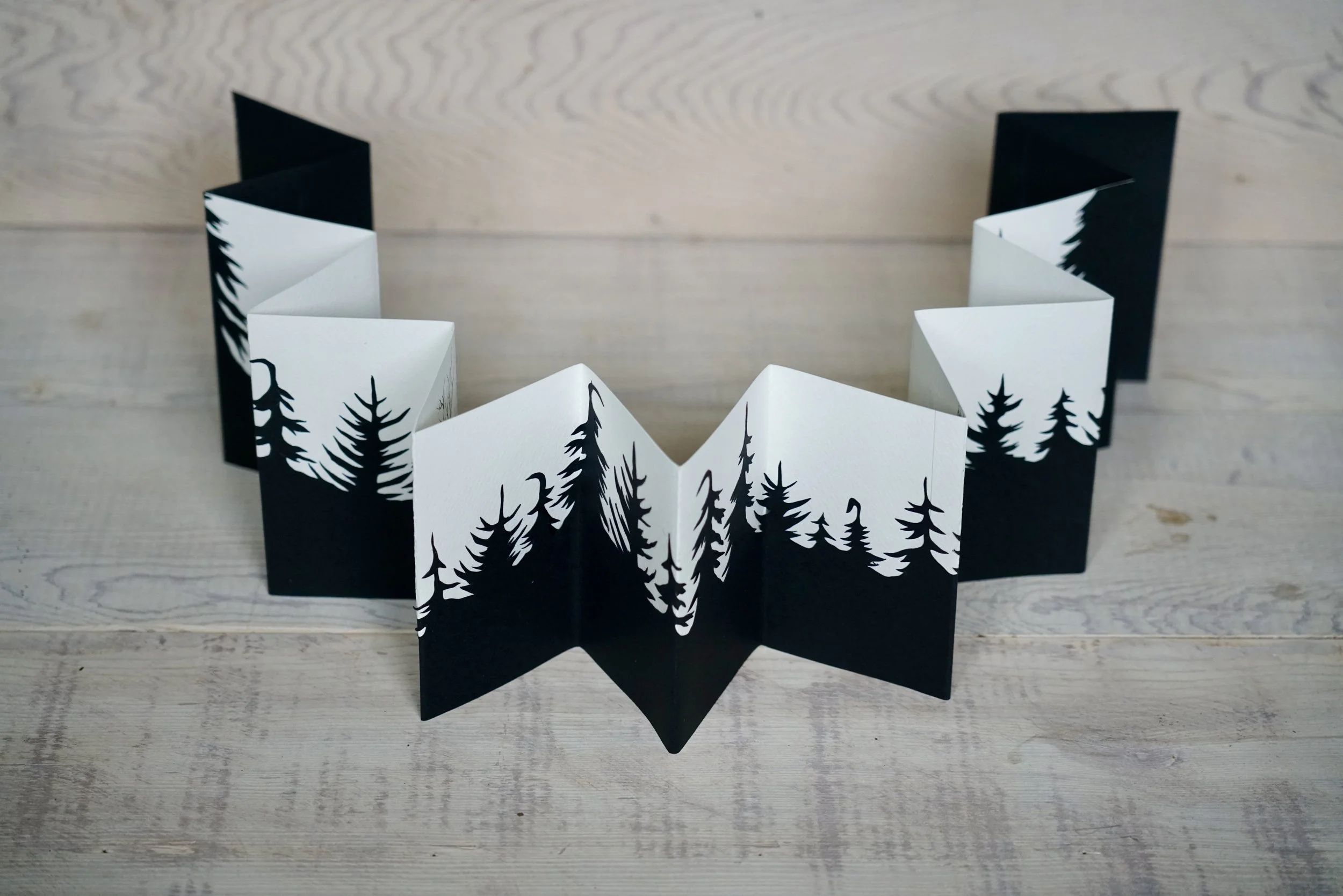 One side of the accordion book is pen and ink drawings of the funky little trees. The other side is a paper cut silhouette depicting the Southeast Alaskan forest tree line. The whole accordion book folds into a custom paper box.